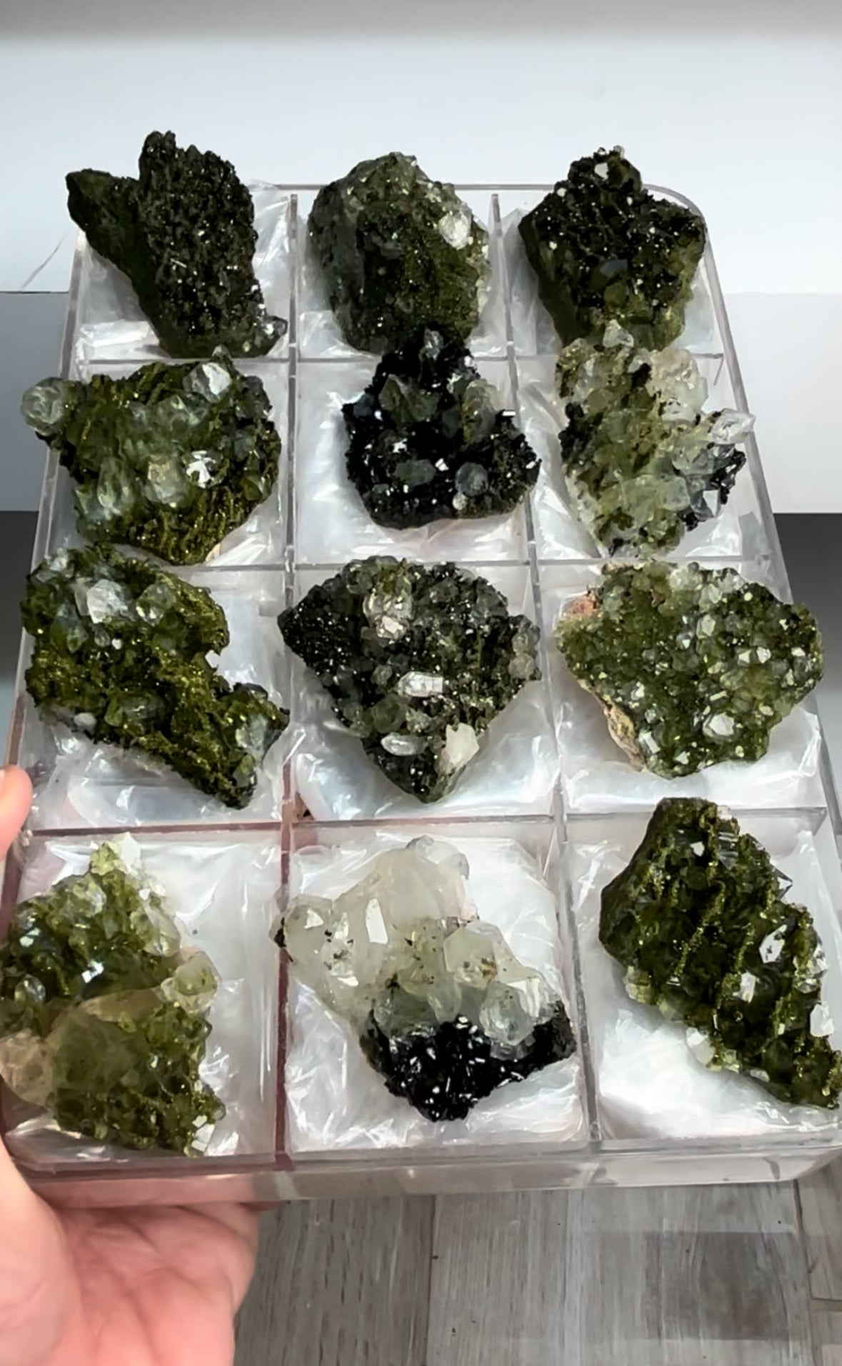 High Grade Forest Green Epidote with Quartz Super sparkly and amazing 12 Piece Lot Size range: 62 - 30 mm... Read more