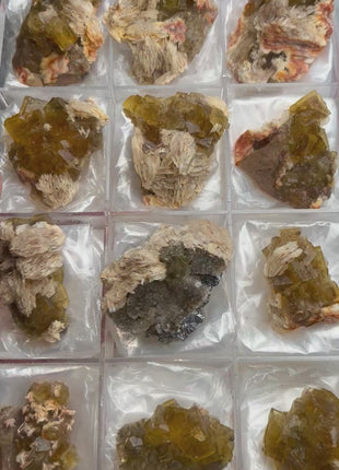 Yellow Fluorite with Barite Flowers lot 12 Piece Lot From: Tizi-n-Tichka, Ouarzazate Province, Morocco Size range: 72 - 38 mm Total... Read more