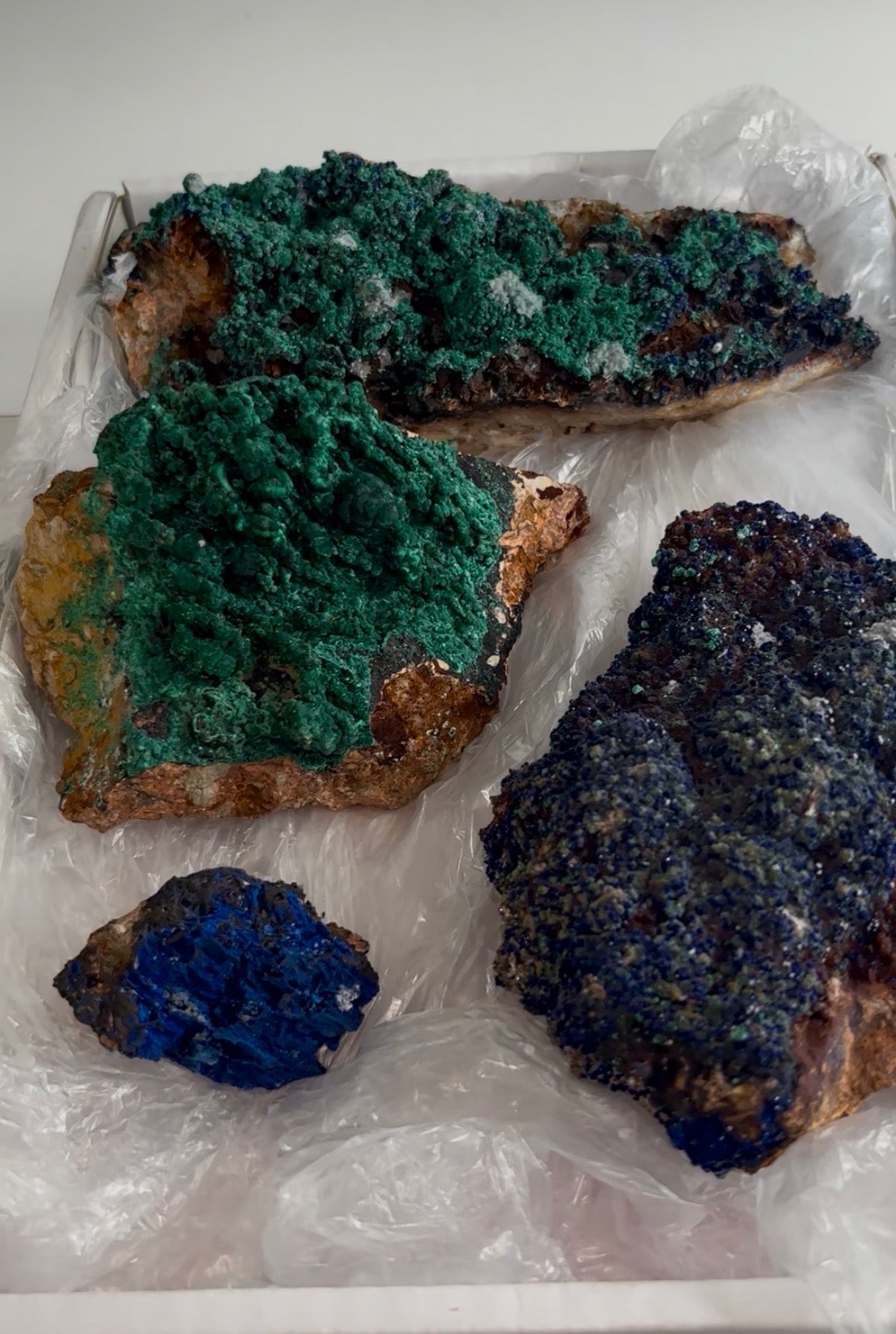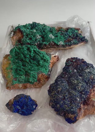 Green Malachite and Blue Azurite Specimens 4 Piece Lot From: Aouli, Mibladen, Midelt Province, Drâa-Tafilalet Region, Morocco Size range: 190 - 58... Read more