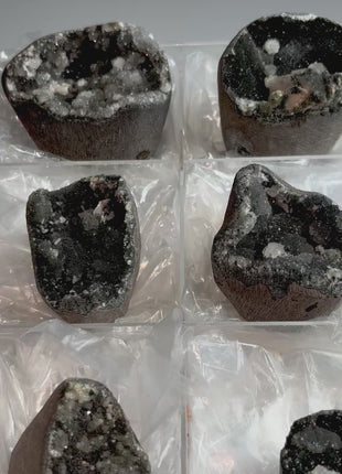 Druzy Black Chalcedony Geode with Lustrous Crystals Origin: Nashik, Maharashtra, India 6 Pieces Size Range: 70 - 38 mm Total... Read more
