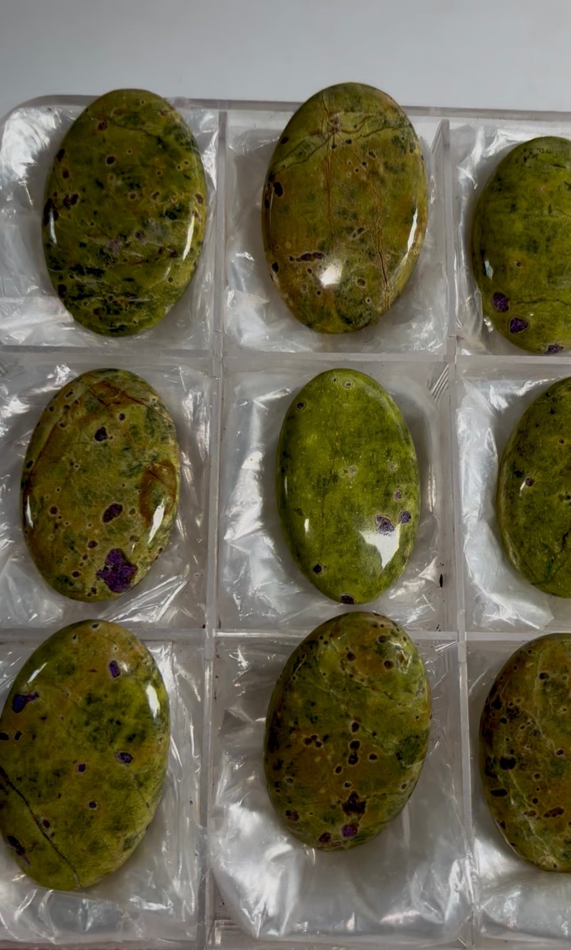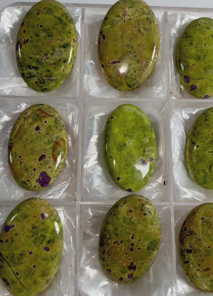 Atlantisite the trade name for a stone composed of Serpentine and Stichtite. Serpentine, the dominant mineral in atlantisite, is bright green and gives the stone its unique base color. Embedded within this green serpentine are patches or veins of Stichtite, which adds vibrant purple hues to the stone. The result is a mesmerizing contrast between green and purple that makes atlantisite instantly recognizable and highly sought after.