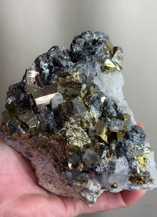 Pyrite with Galena, Quartz Origin: Kalimantan, Indonesia Size: 120 x 107 x 86 mm Weight: 1323 grams Read more
