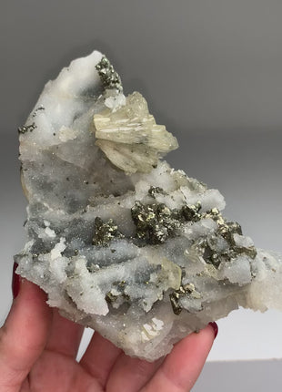 Yellow Barite Flower with Pyrite and Quartz Origin: Bou Nahas Mine, Oumjrane area, Morocco Size: 123 x 80 x... Read more