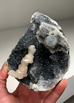 Druzy Blue Chalcedony Geode with Stilbite Flower Origin: Nashik, India Size: 120 x 97 x 47 mm Weight: 437 grams Read more