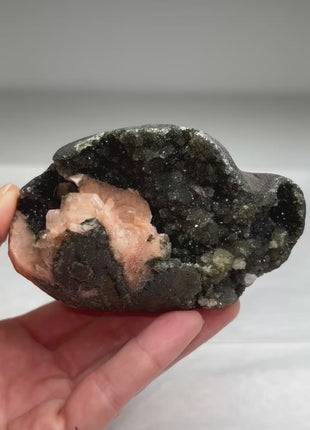 Druzy Black Chalcedony Geode with Pink Stilbite