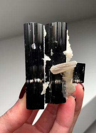 New Arrival ! Glassy Black Tourmaline with Snow Albite Flowers and Muscovite