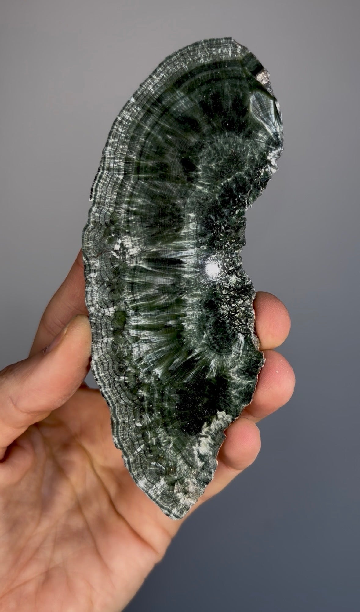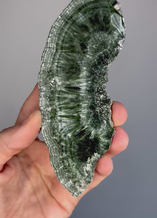 Seraphinite is a gem variety of Clinochlore, a magnesium iron aluminum silicate, characterized by a deep green color laced with shimmering patterns of silver that reflect light . It is found only in the Lake Baikal region of Siberia, Russia. It is also known as Serafina or Green Chlorite.
