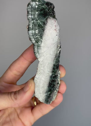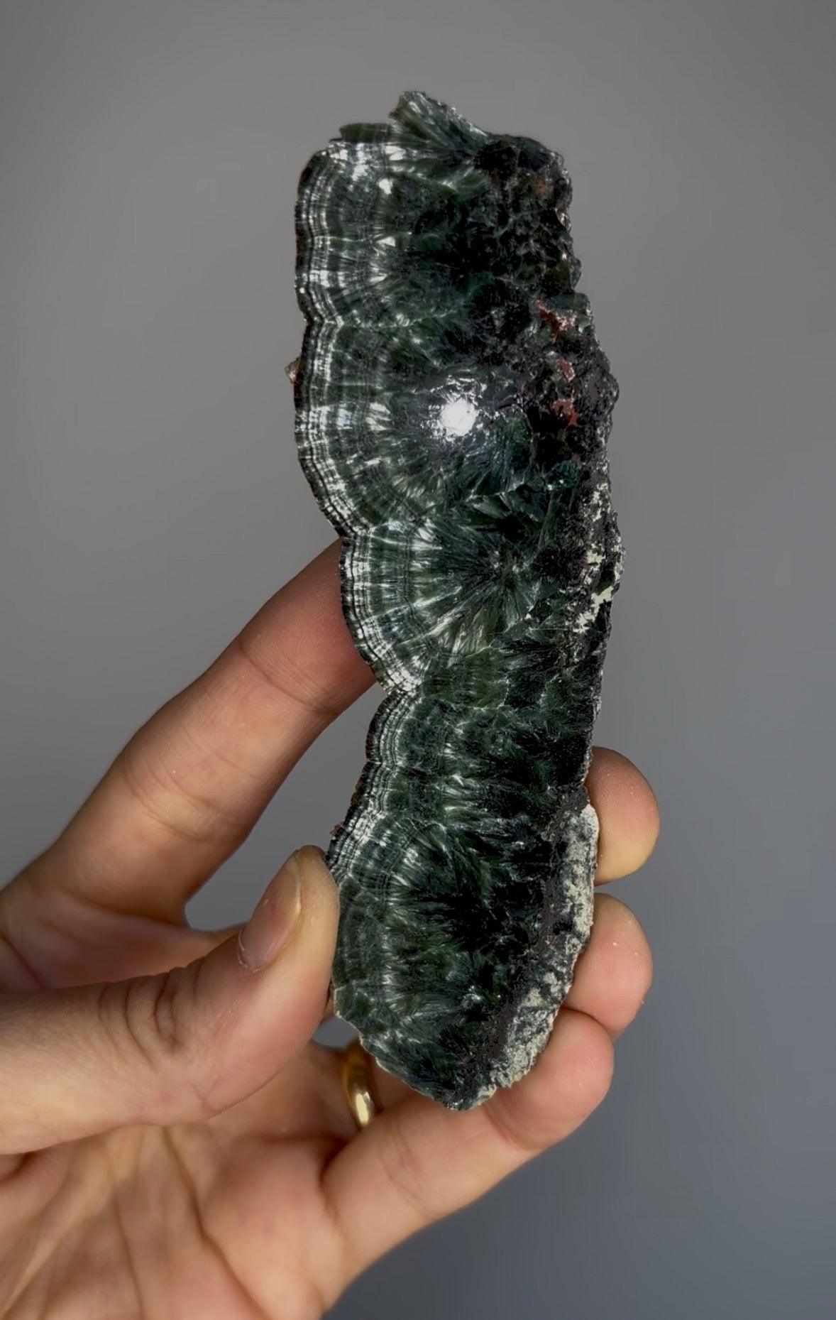 Seraphinite is a gem variety of Clinochlore, a magnesium iron aluminum silicate, characterized by a deep green color laced with shimmering patterns of silver that reflect light . It is found only in the Lake Baikal region of Siberia, Russia. It is also known as Serafina or Green Chlorite.