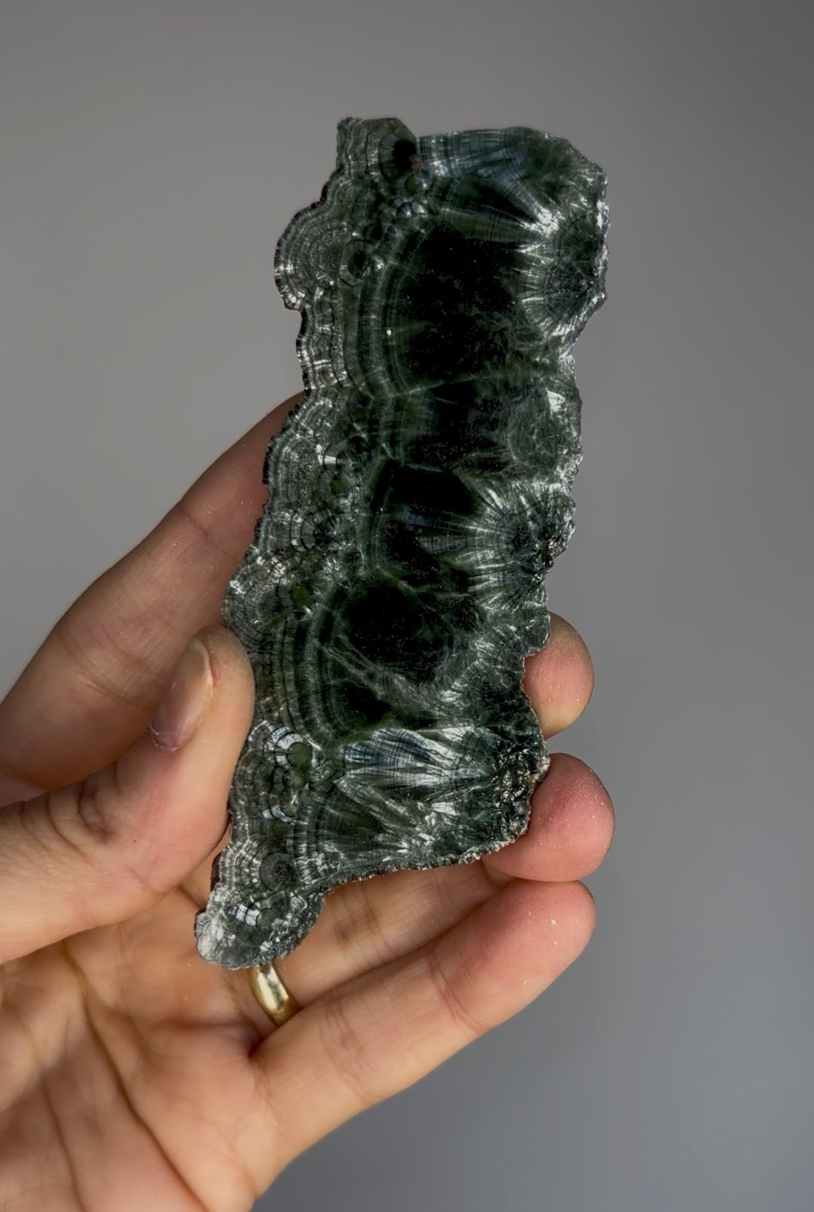 Seraphinite is a gem variety of Clinochlore, a magnesium iron aluminum silicate, characterized by a deep green color laced with shimmering patterns of silver that reflect light . It is found only in the Lake Baikal region of Siberia, Russia. It is also known as Serafina or Green Chlorite.