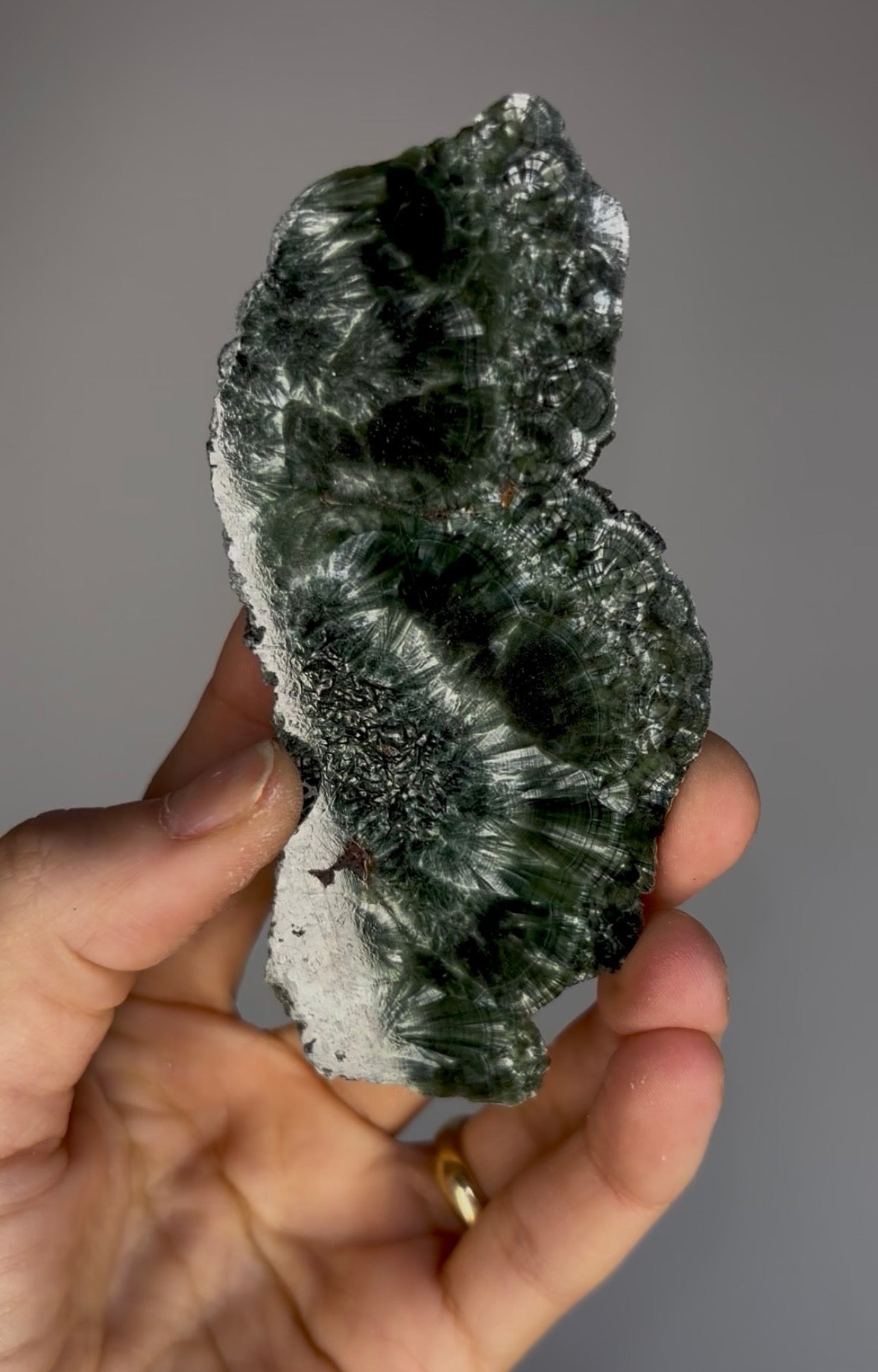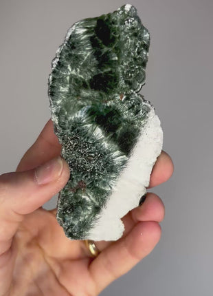 Seraphinite is a gem variety of Clinochlore, a magnesium iron aluminum silicate, characterized by a deep green color laced with shimmering patterns of silver that reflect light . It is found only in the Lake Baikal region of Siberia, Russia. It is also known as Serafina or Green Chlorite.