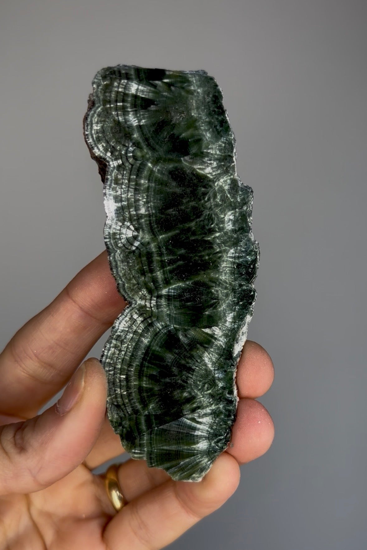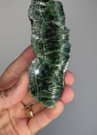 Seraphinite is a gem variety of Clinochlore, a magnesium iron aluminum silicate, characterized by a deep green color laced with shimmering patterns of silver that reflect light . It is found only in the Lake Baikal region of Siberia, Russia. It is also known as Serafina or Green Chlorite.