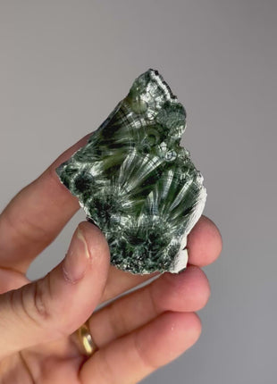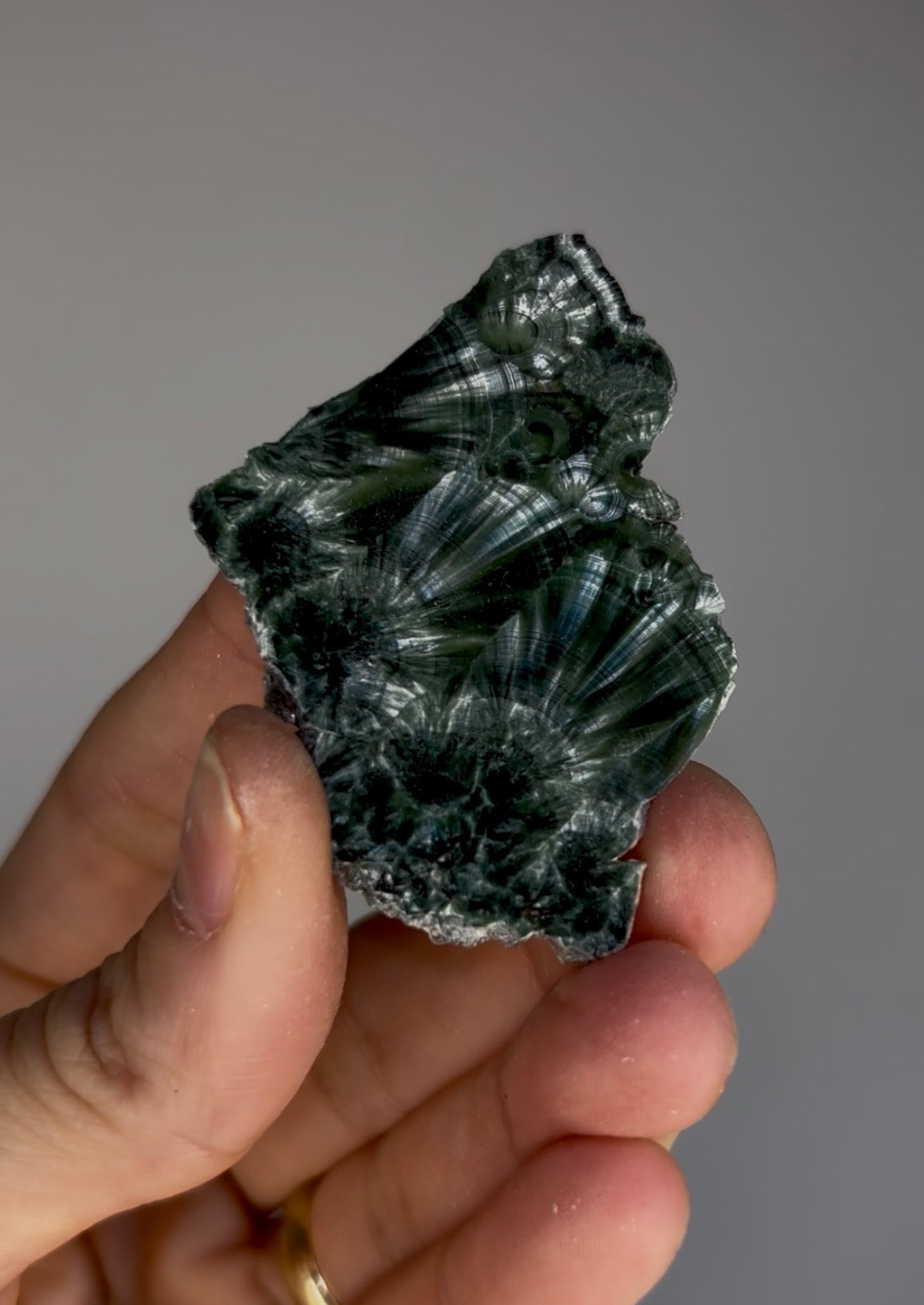 Seraphinite is a gem variety of Clinochlore, a magnesium iron aluminum silicate, characterized by a deep green color laced with shimmering patterns of silver that reflect light . It is found only in the Lake Baikal region of Siberia, Russia. It is also known as Serafina or Green Chlorite.