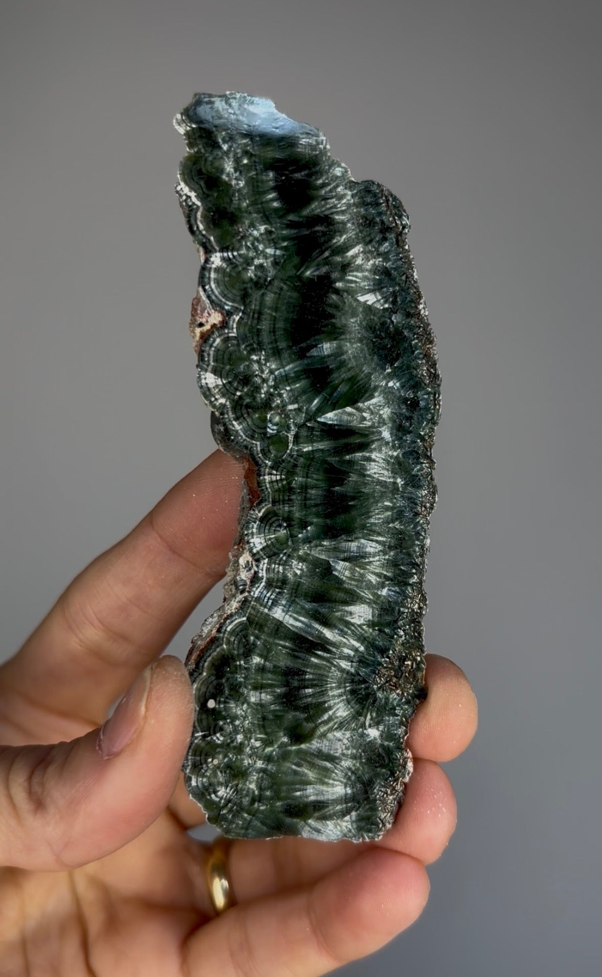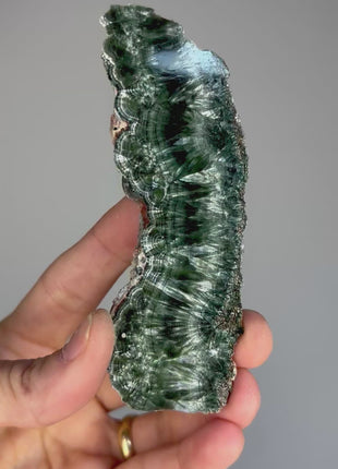 Seraphinite is a gem variety of Clinochlore, a magnesium iron aluminum silicate, characterized by a deep green color laced with shimmering patterns of silver that reflect light . It is found only in the Lake Baikal region of Siberia, Russia. It is also known as Serafina or Green Chlorite.