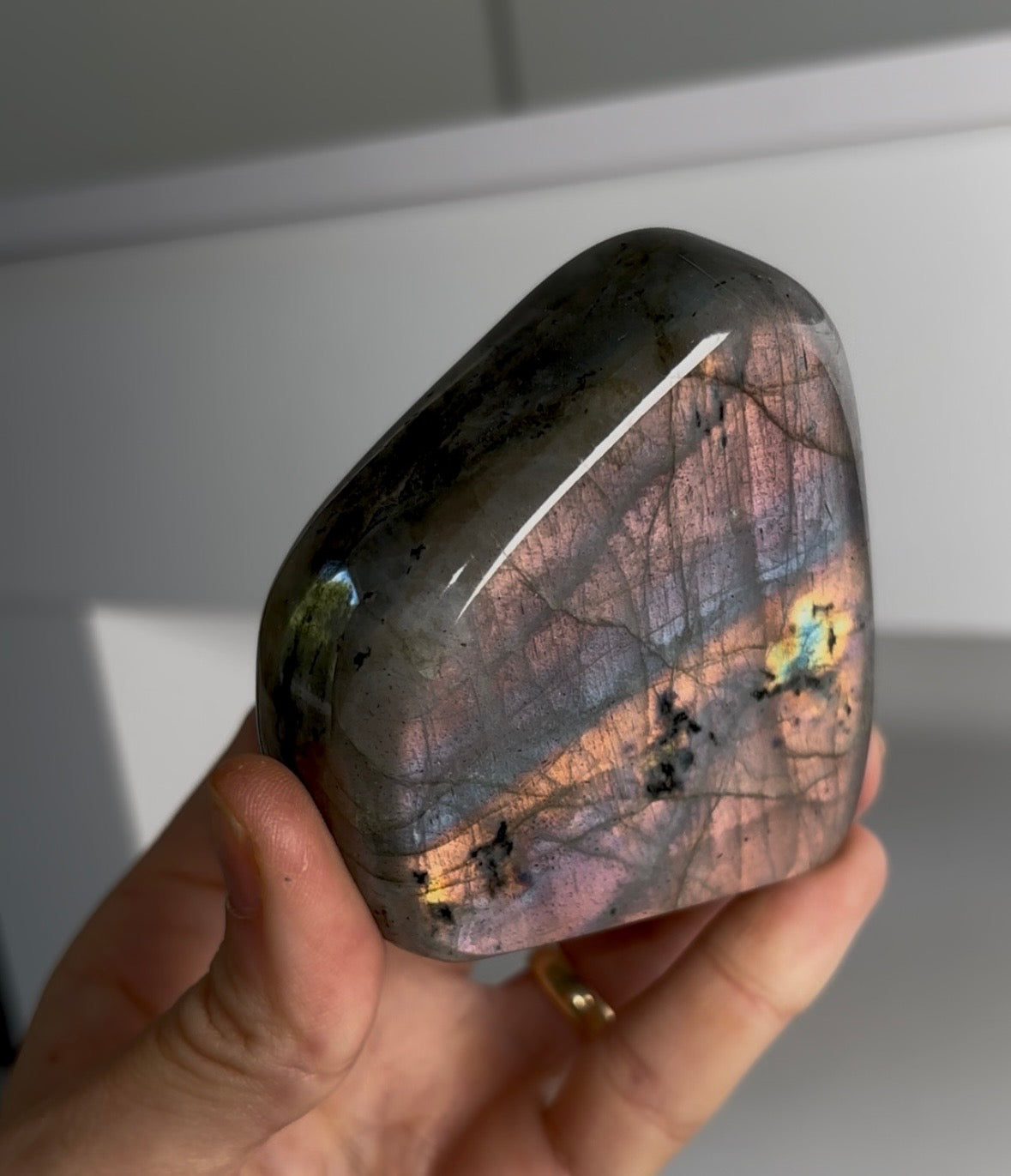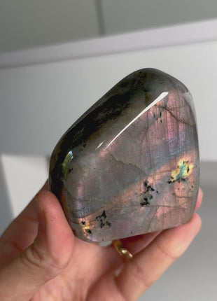 Flashy Labradorite perfectly polished with shiny, smooth surface Origin: Madagascar Size: 71 x 68 x 34 mm Weight: 275 gr Read more