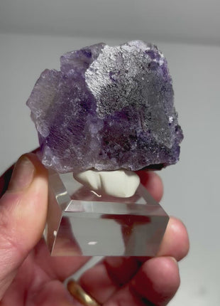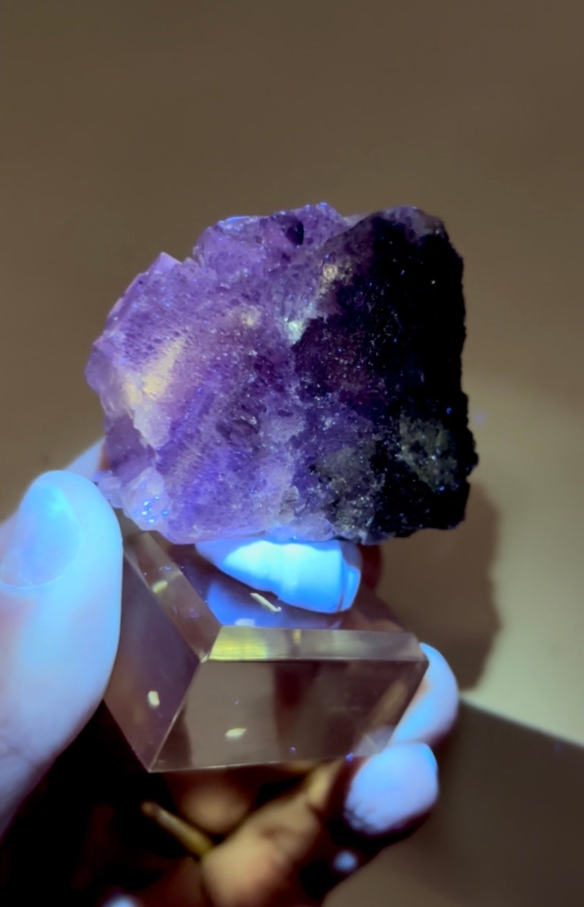 Fluorite specimen with petroleum oil inclusions. Unique fluorescence when exposed to ultraviolet (UV) light. Amazing "galaxy-like" glow. This fluorescence is a result of the presence of hydrocarbon compounds within the fluorite structure.