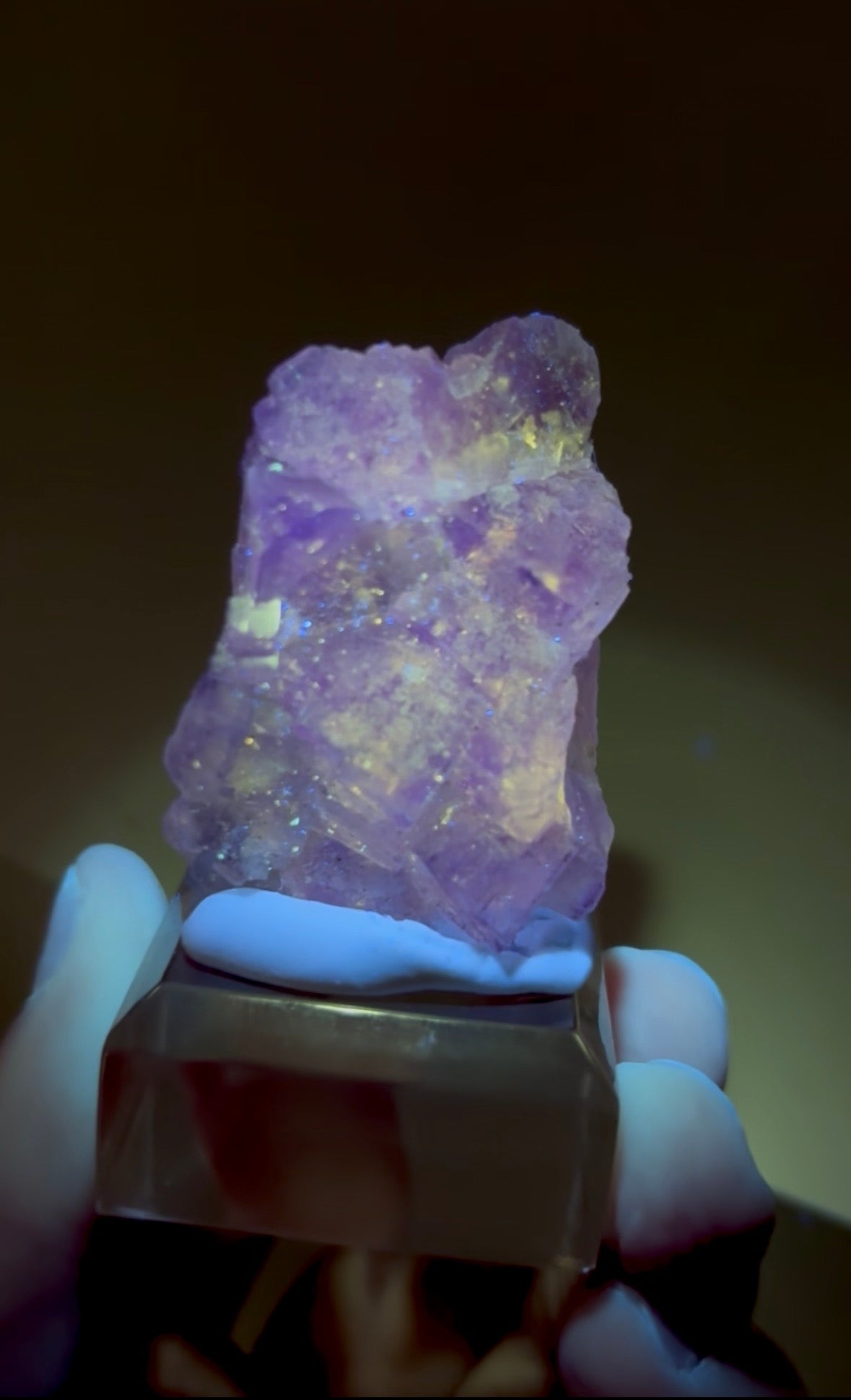 Fluorite specimen with petroleum oil inclusions. Unique fluorescence when exposed to ultraviolet (UV) light. Amazing "galaxy-like" glow. This fluorescence is a result... Read more