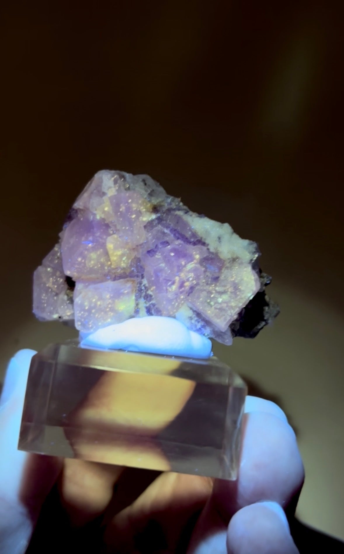 Fluorite specimen with petroleum oil inclusions. Unique fluorescence when exposed to ultraviolet (UV) light. Amazing "galaxy-like" glow. This fluorescence is a result... Read more