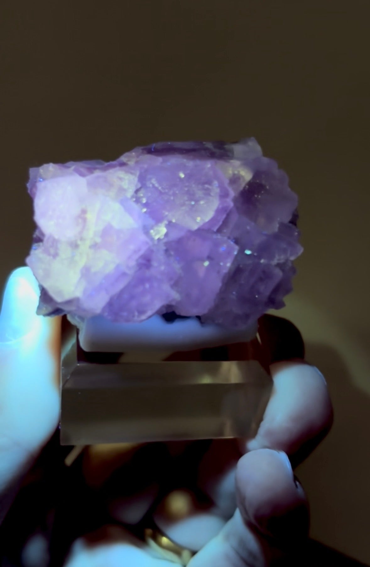 Fluorite specimen with petroleum oil inclusions. Unique fluorescence when exposed to ultraviolet (UV) light. Amazing "galaxy-like" glow. This fluorescence is a result of the presence of hydrocarbon compounds within the fluorite structure.
