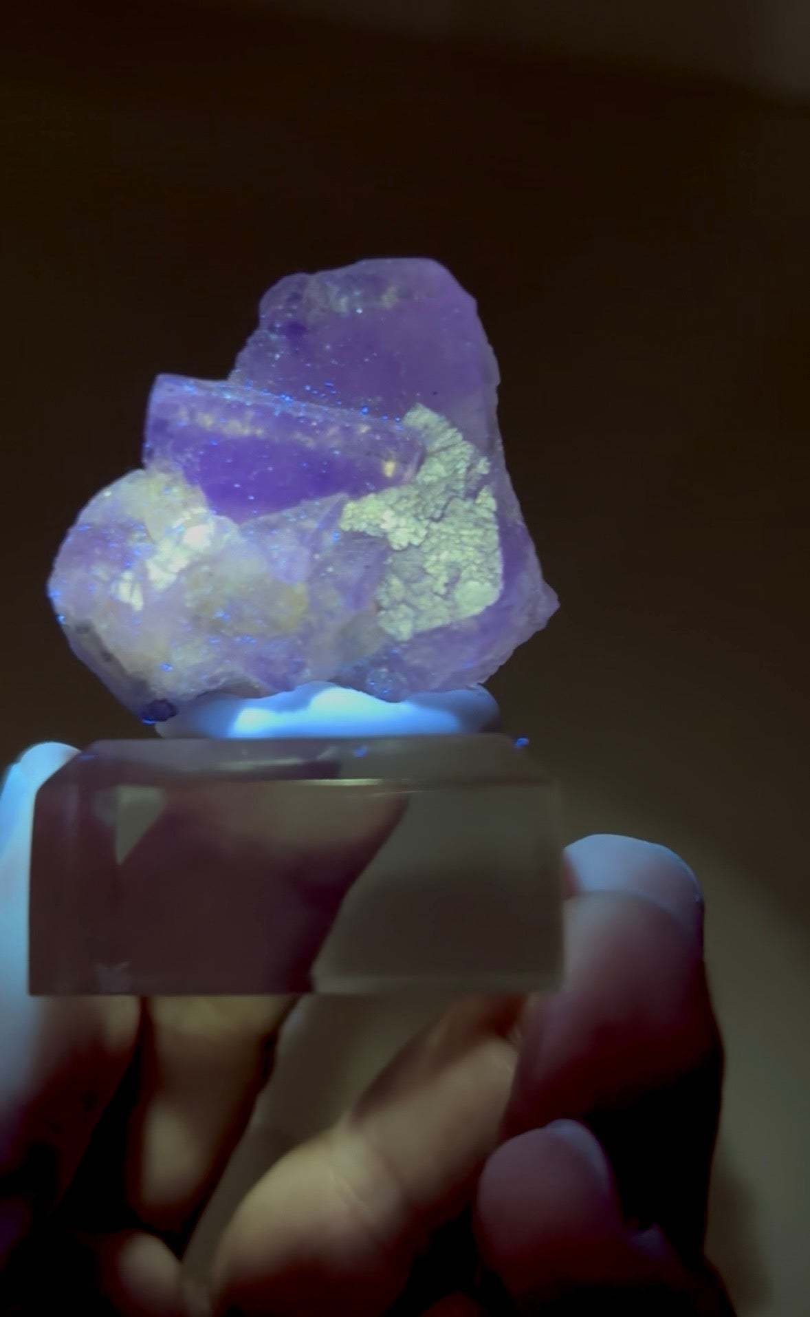 Fluorite specimen with petroleum oil inclusions. Unique fluorescence when exposed to ultraviolet (UV) light. Amazing "galaxy-like" glow. This fluorescence is a result of the presence of hydrocarbon compounds within the fluorite structure.
