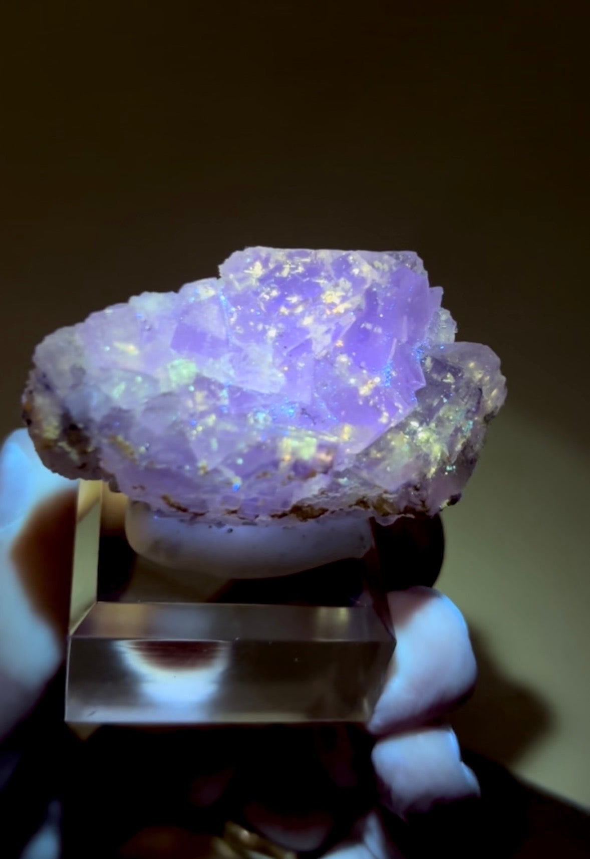 Fluorite specimen with petroleum oil inclusions. Unique fluorescence when exposed to ultraviolet (UV) light. Amazing "galaxy-like" glow. This fluorescence is a result... Read more