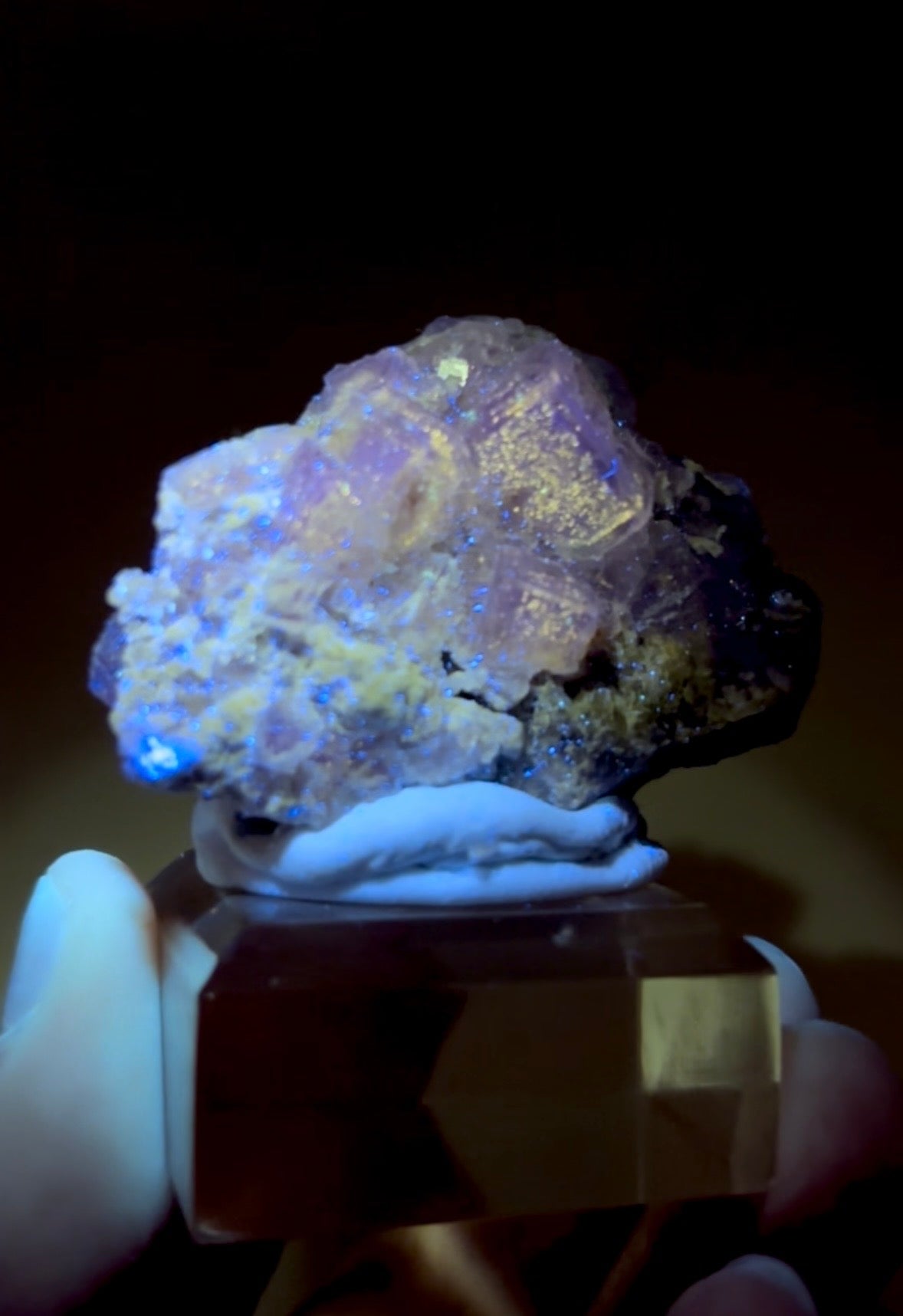 Fluorite specimen with petroleum oil inclusions. Unique fluorescence when exposed to ultraviolet (UV) light. Amazing "galaxy-like" glow. This fluorescence is a result of the presence of hydrocarbon compounds within the fluorite structure.