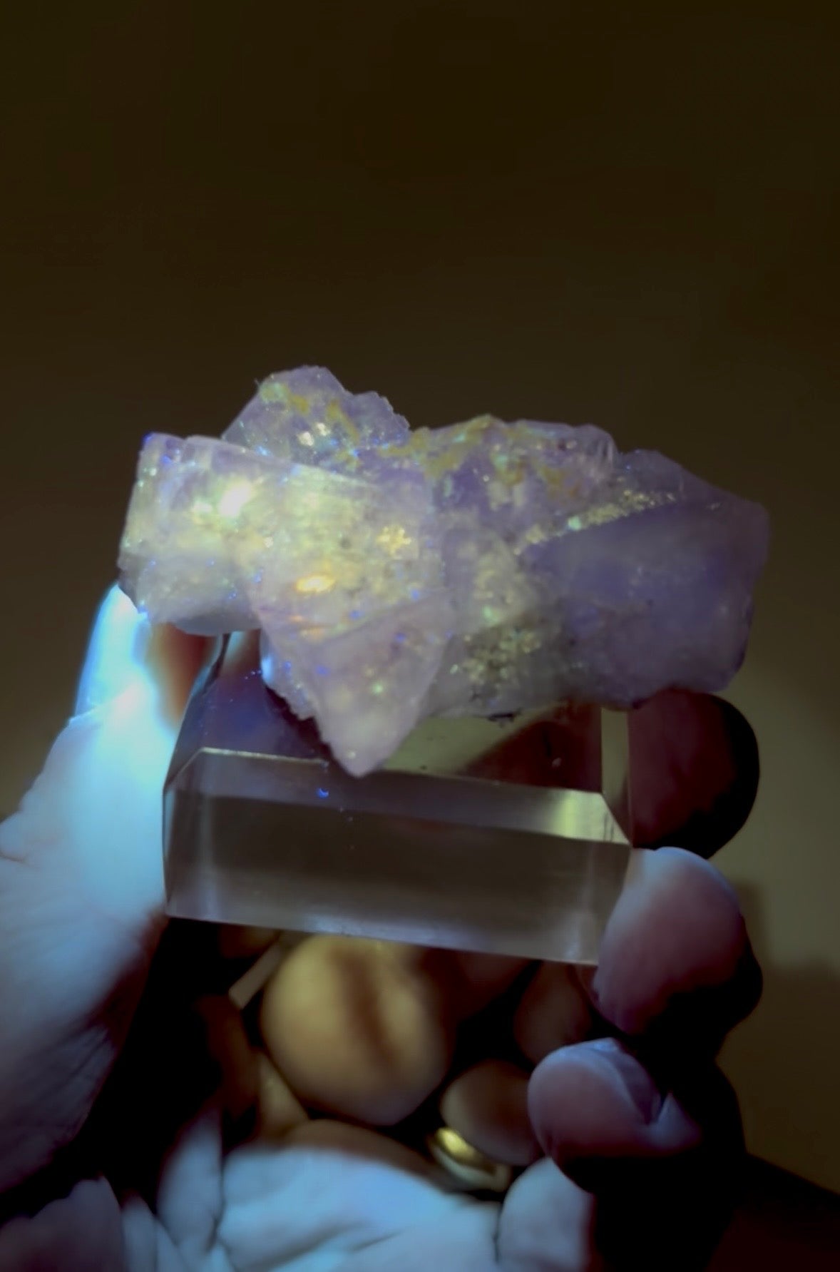 Fluorite specimen with petroleum oil inclusions. Unique fluorescence when exposed to ultraviolet (UV) light. Amazing "galaxy-like" glow. This fluorescence is a result... Read more