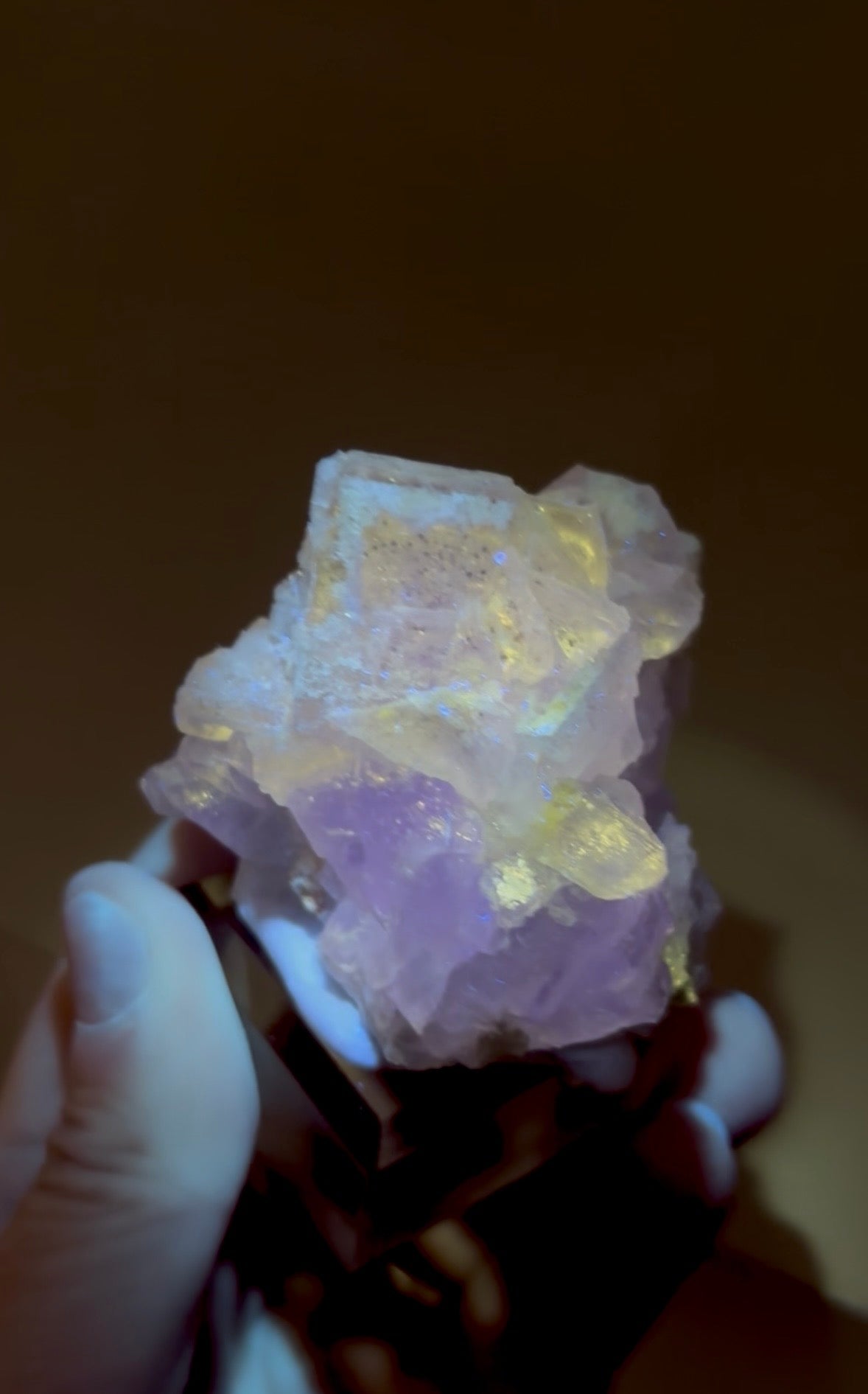 Fluorite specimen with petroleum oil inclusions. Unique fluorescence when exposed to ultraviolet (UV) light. Amazing "galaxy-like" glow. This fluorescence is a result... Read more