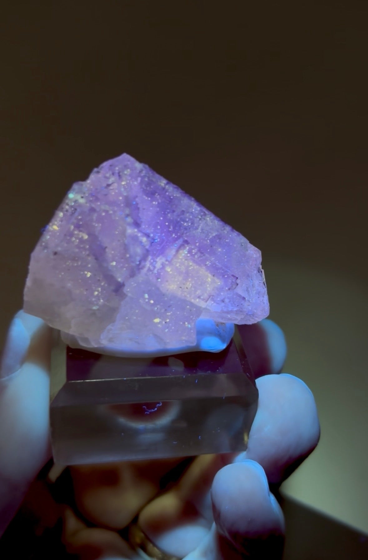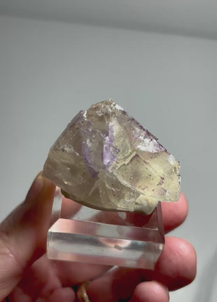 Fluorite specimen with petroleum oil inclusions. Unique fluorescence when exposed to ultraviolet (UV) light. Amazing "galaxy-like" glow. This fluorescence is a result of the presence of hydrocarbon compounds within the fluorite structure.