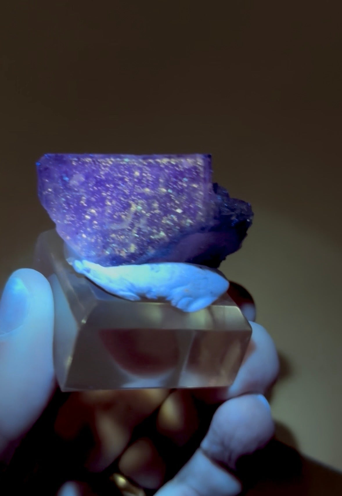 Fluorite specimen with petroleum oil inclusions. Unique fluorescence when exposed to ultraviolet (UV) light. Amazing "galaxy-like" glow. This fluorescence is a result... Read more