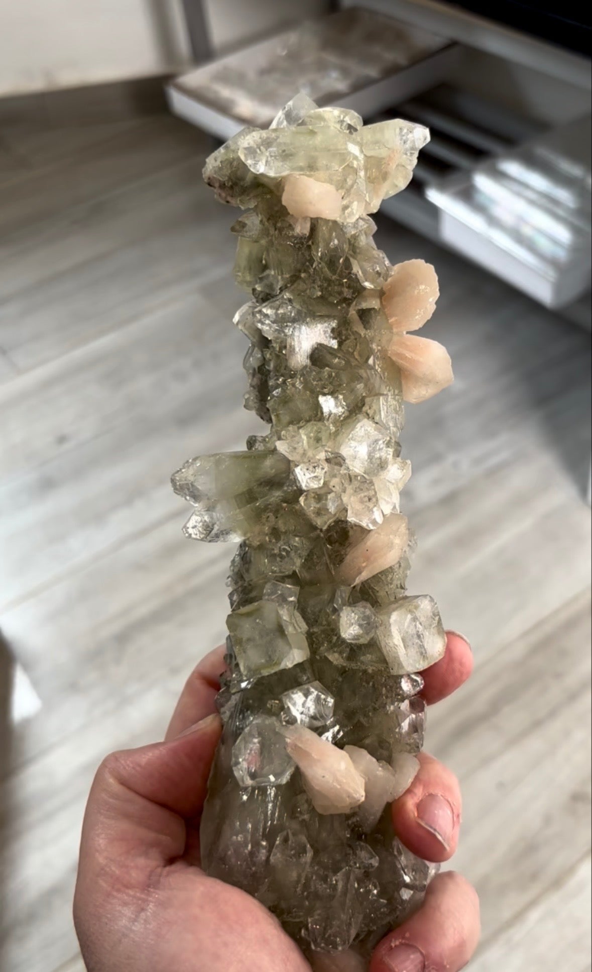 New arrival ! Gemmy Green Apophyllite Stalactite with Pink Stilbite