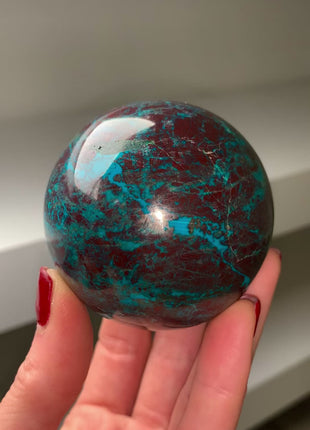 Amazing Combination of Bright Blue Chrysocolla, Red Cuprite and Green Malachite Sphere From: Peru Diameter: 61 mm Weight: 309 Grams... Read more