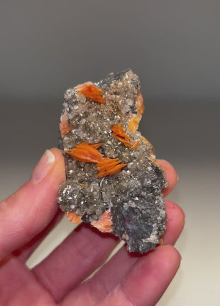 Orange Barite Flowers with Cerussite and Galena Origin: Mibladen, Haute Moulouya Basin, Midelt, Morocco Size: 65 x 58 x 18... Read more