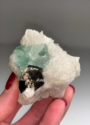 New ! Glassy Black Tourmaline with Snow Albite Flowers and Green Fluorite