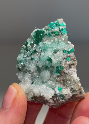 Emerald Green Dioptase with Snowy Calcite From Reneville, Congo Size: 51 x 37 x 26 mm Weight: 199.6 carats Read more