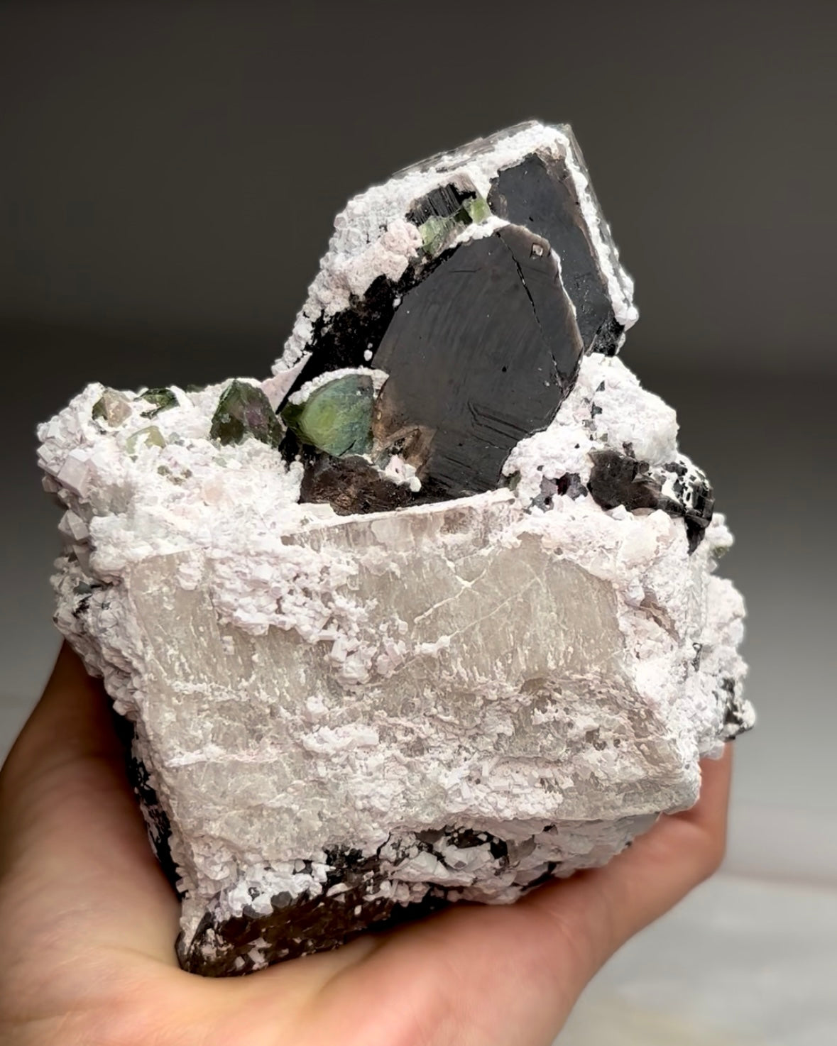 Smoky Quartz with Watermelon Tourmaline Origin: Afghanistan Size : 133 x 111 x 92 mm Weight: 918 grams Read more