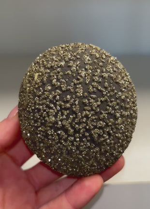 Sparkling, sharp, metallic Pyrite crystals with concentric "rings" on a "sphere" of shale. Completely natural from Earth. Origin: Dongchuan District, Kunming Prefecture,... Read more