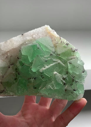 Unusual Icy Green Octahedral Fluorite with Purple Corners together with Quartz Origin: Chenzhou, Hunan, China Size range: 160 - 108 -... Read more