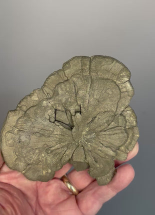 These extraordinary crystal structures known as “Pyrite Sun” actually formed deep underground under great pressure about 350 million years ago. These round disks sometimes occur between seams of coal and may be found when coal is mined. Although pyrite is quite common worldwide, the disk form is virtually unique to Illinois.