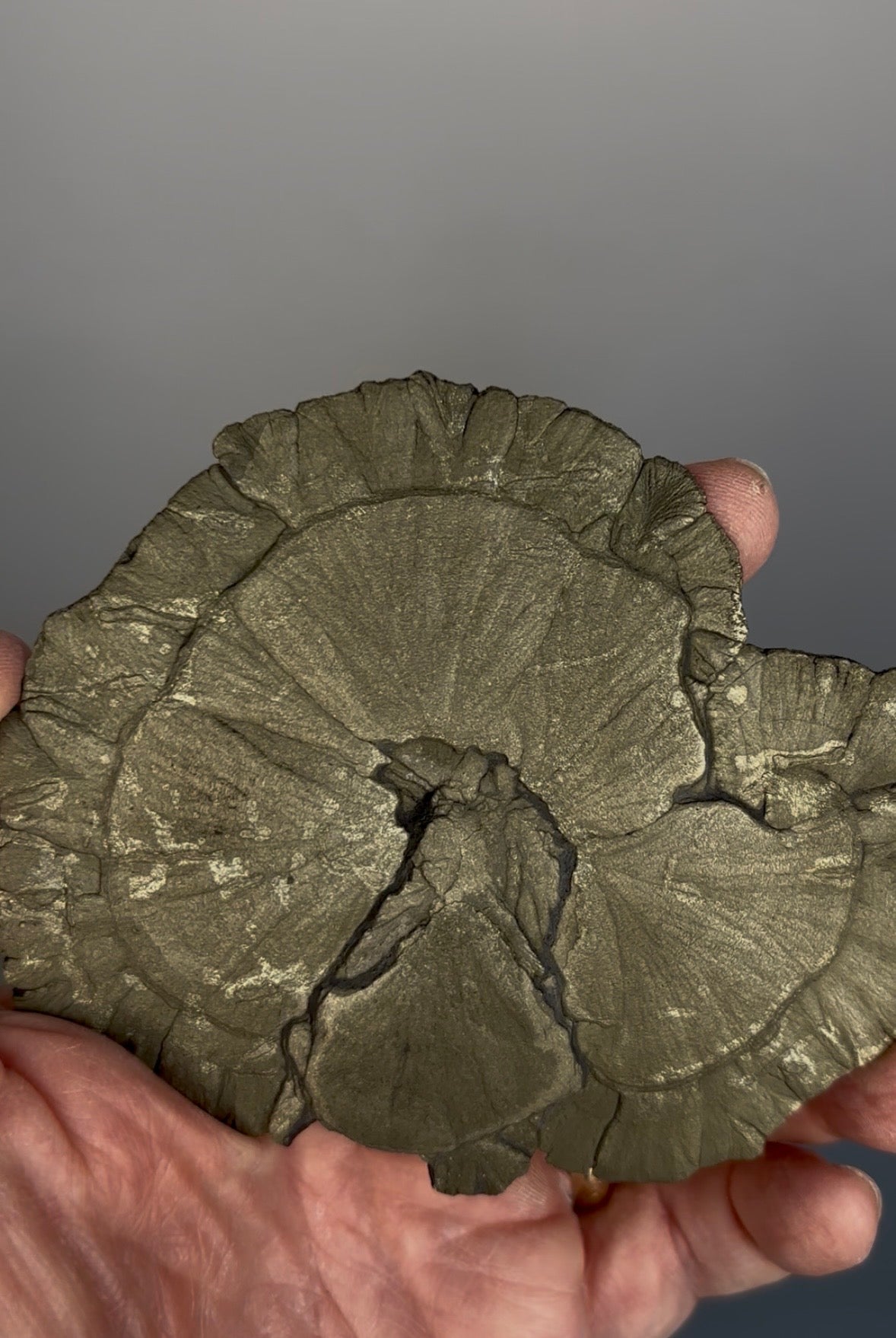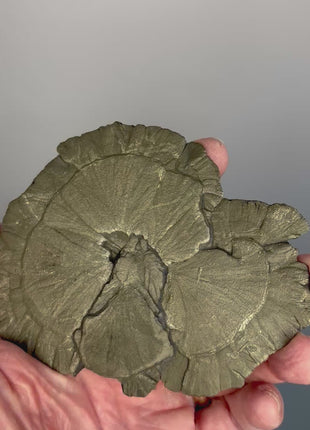 These extraordinary crystal structures known as “Pyrite Sun” actually formed deep underground under great pressure about 350 million years ago. These round disks sometimes occur between seams of coal and may be found when coal is mined. Although pyrite is quite common worldwide, the disk form is virtually unique to Illinois.