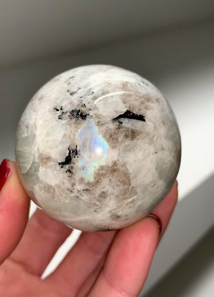 Flashy Rainbow Moonstone Sphere With Beautiful Biotite Perfectly polished with shiny surface Origin: India Diameter:  55 mm Weight: 192 Grams Read more