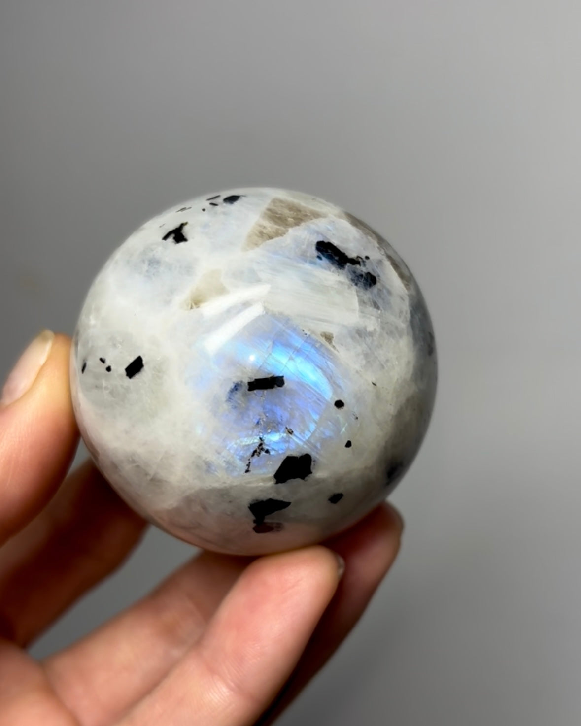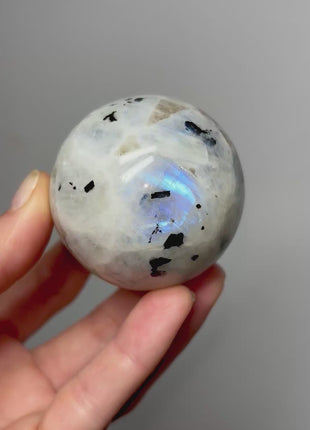 Flashy Rainbow Moonstone Sphere With Beautiful Biotite Perfectly polished with shiny surface Origin: India Diameter:  59 mm Weight: 217 Grams Read more