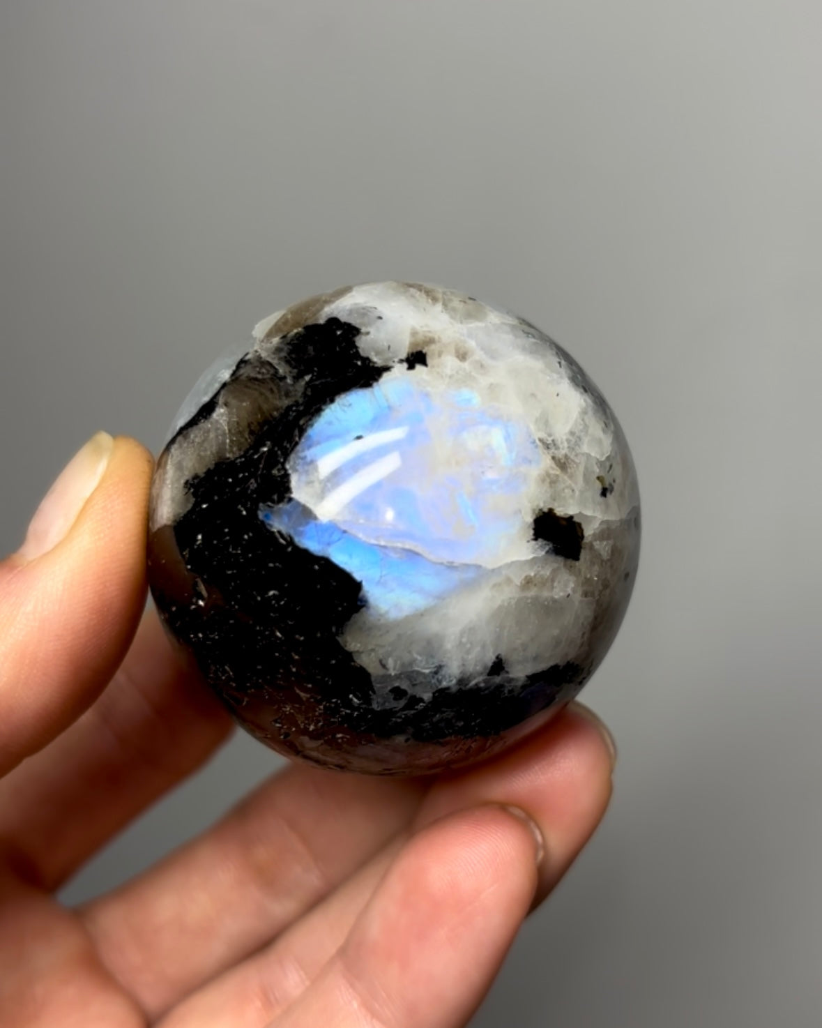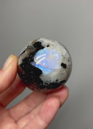 Flashy Rainbow Moonstone Sphere With Beautiful Biotite Perfectly polished with shiny surface Origin: India Diameter:  51 mm Weight: 152 Grams Read more