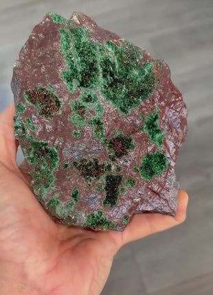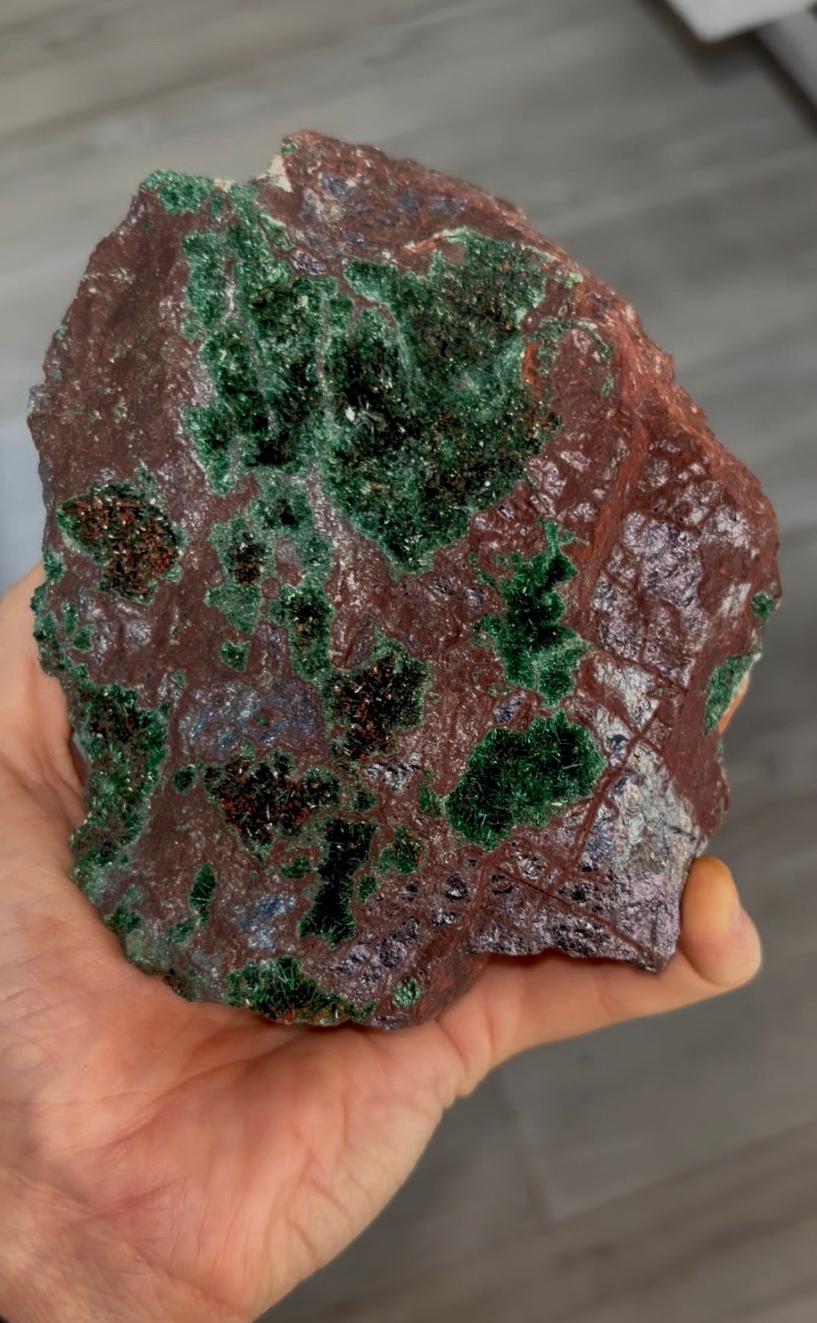 Deep emerald green Brochanthite geode with lustrous crystals Great sample for the species and locality. Origin: Bou Bekker, Touissit, Oujda, Morocco Size : 150... Read more