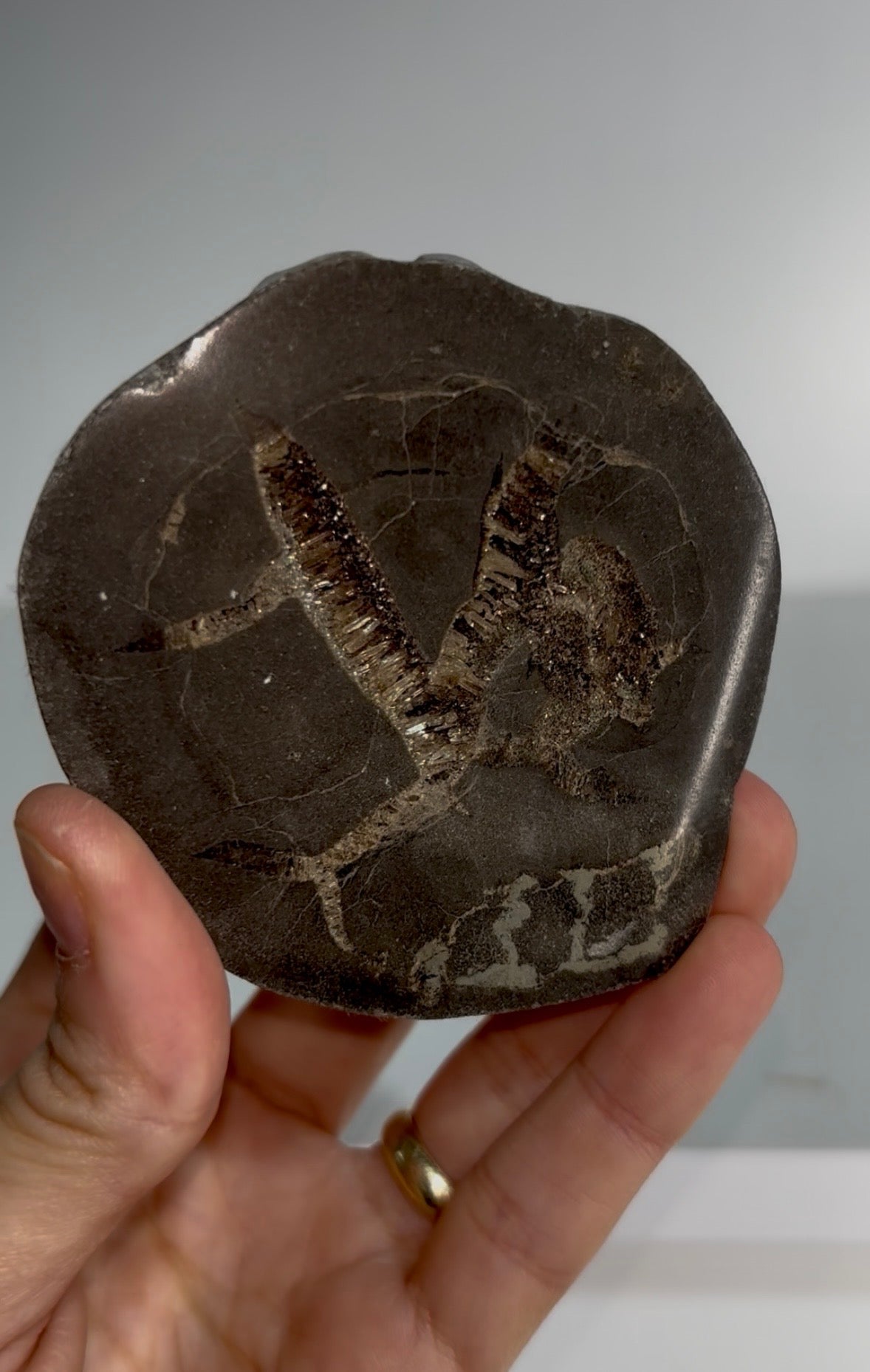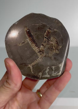 This rare piece features a Septarian geode half that is polished with an open interior showing fine sparkling Barite crystals within. The name Septarian is derived from the Latin word " septum", meaning partition, and refers to the divisions or cracks that are typical of this sort of rock. They are generally formed in calcium rich clay which then hardens to form this type of limestone nodule, with the dark grey exterior. Over many years, the rock contracts, giving rise to cracks, later becoming filled with water. Calcite crystals slowly then formed in the center. This specimen of French barite has excellent form and beautiful subtle crystallization features.