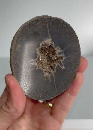 This rare piece features a Septarian geode half that is polished with an open interior showing fine sparkling Barite crystals within. The name Septarian is derived from the Latin word " septum", meaning partition, and refers to the divisions or cracks that are typical of this sort of rock. They are generally formed in calcium rich clay which then hardens to form this type of limestone nodule, with the dark grey exterior. Over many years, the rock contracts, giving rise to cracks, later becoming filled with water. Calcite crystals slowly then formed in the center. This specimen of French barite has excellent form and beautiful subtle crystallization features.