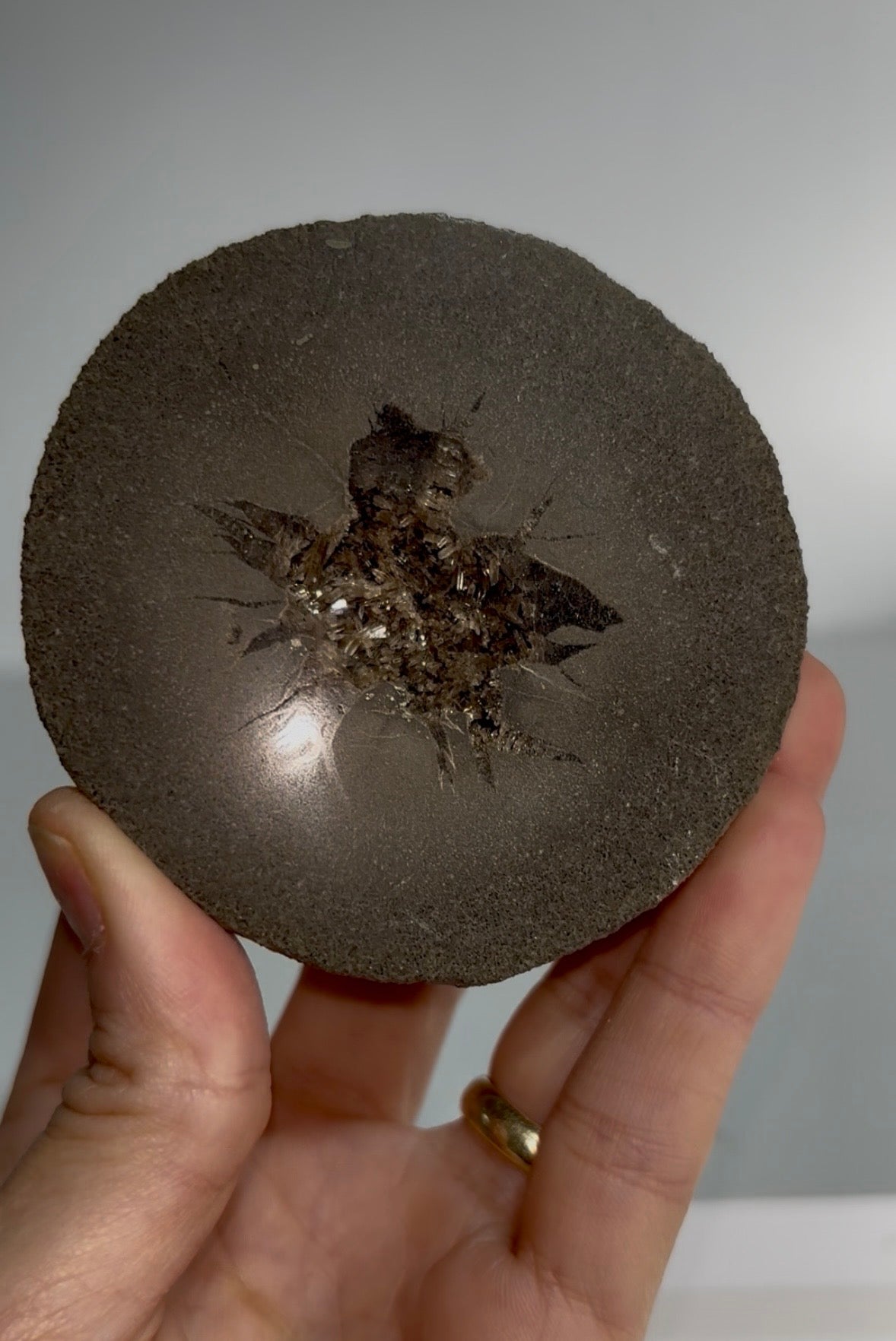 This rare piece features a Septarian geode half that is polished with an open interior showing fine sparkling Barite crystals within. The name Septarian is derived from the Latin word " septum", meaning partition, and refers to the divisions or cracks that are typical of this sort of rock. They are generally formed in calcium rich clay which then hardens to form this type of limestone nodule, with the dark grey exterior. Over many years, the rock contracts, giving rise to cracks, later becoming filled with water. Calcite crystals slowly then formed in the center. This specimen of French barite has excellent form and beautiful subtle crystallization features.