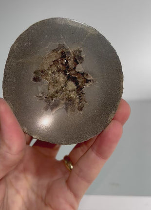 This rare piece features a Septarian geode half that is polished with an open interior showing fine sparkling Barite crystals within. The name Septarian is derived from the Latin word " septum", meaning partition, and refers to the divisions or cracks that are typical of this sort of rock. They are generally formed in calcium rich clay which then hardens to form this type of limestone nodule, with the dark grey exterior. Over many years, the rock contracts, giving rise to cracks, later becoming filled with water. Calcite crystals slowly then formed in the center. This specimen of French barite has excellent form and beautiful subtle crystallization features.