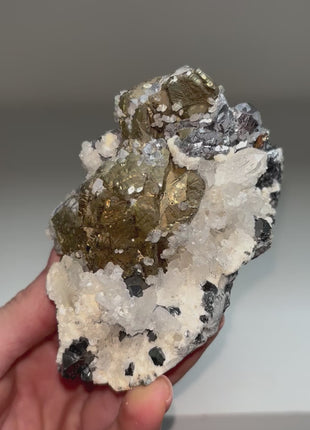 Crazy combination of Chalcopyrite, Tetrahedrite, Galena, Calcite and Quartz. Both-sided specimen Very attractive on both sides Origin: Trepca Mine, Kosovo Size Range: 98... Read more