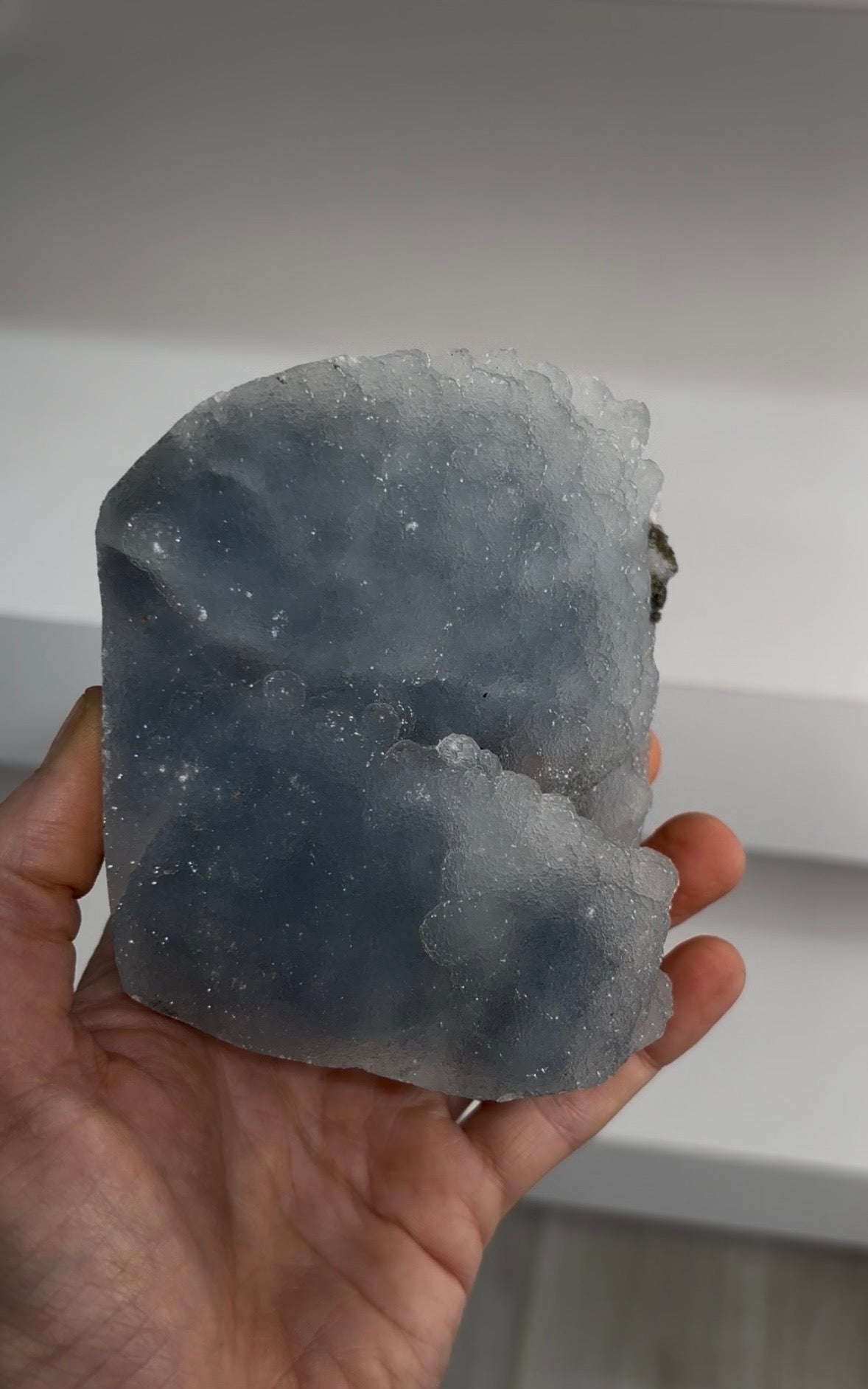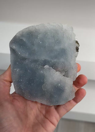 Magical Blue Chalcedony with Sparkly Crystals Origin: Nashik, India Size : 110 x 100 x 58 mm Weight: 628 grams Read more