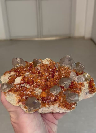 Very Impressive and Colorful Orange Spessartine Garnet with Smoky Quartz Origin: Wushan Spessartine Mine, Tongbei-Yunling, China Large Cabinet Size Read more
